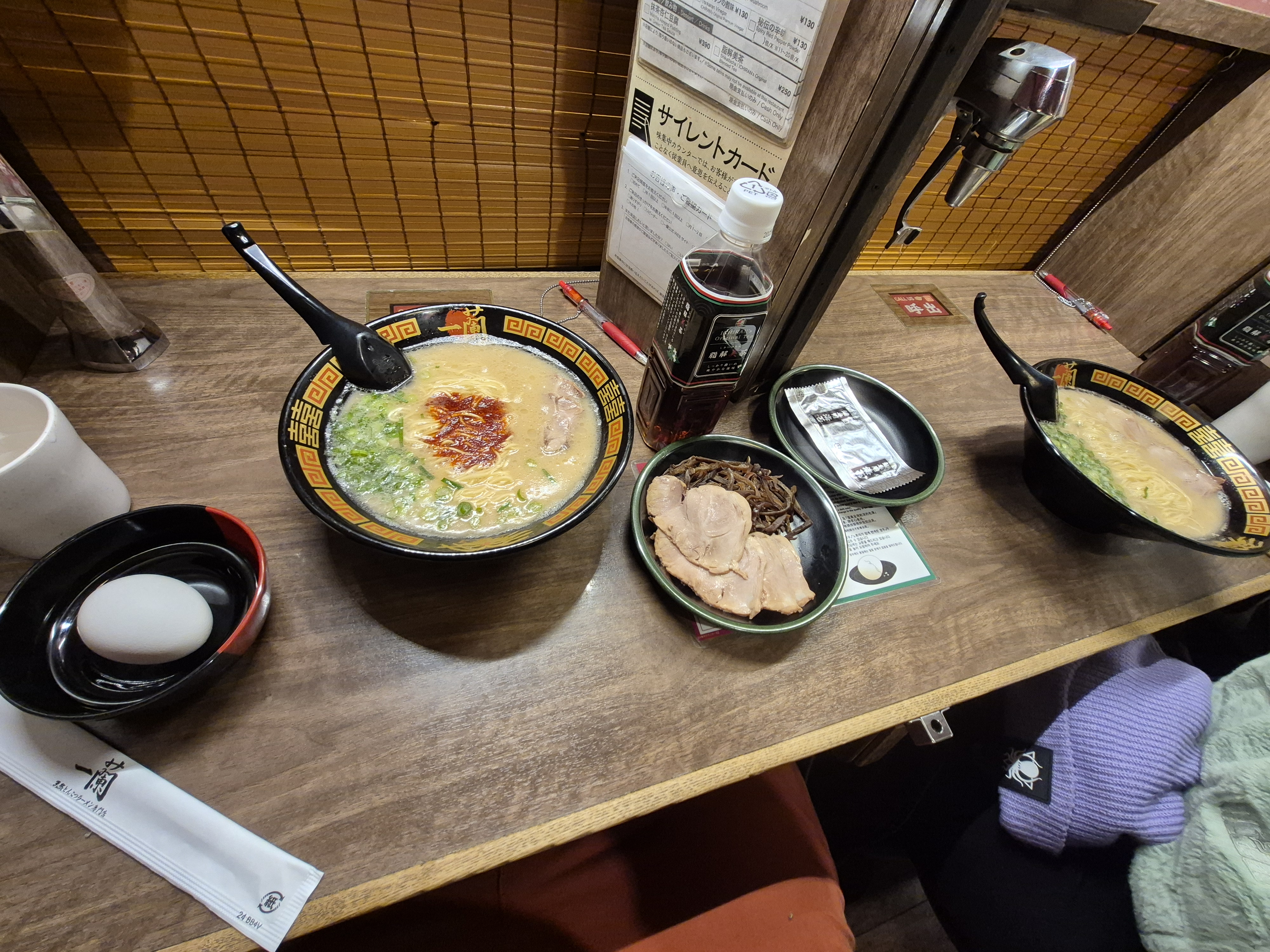 after a brief planning session at the hotel, we traveled a stop down the YR line to Harajuku station. What a cluster f%3k that area is, especially when today was a national holiday and there was parades and protests. The area is known for all kinds of clothes shopping, restaurants, and of course Harajuku girls. The shopping was really cool but nothing in Japan will ever be my size, so I was mostly just exploring. Hannah on the other hand, was like a squirrel in a nut factory. She showed some pretty damn good willpower on a few very expensive items. After an hour of exploring we found a very popular ramen place, with an oddly fast moving line to get in. Well Ichiran Ramen is a ramen bar where they serve 2 dishes (regular & deluxe) and you order and pay from a vending type machine at the entrance. That place was efficient, no servers, just a line of bars with a little door at the back of each bar spot. After you sat down a person behind the doors takes your card, and a few minutes later. A delicious bowl of ramen arrives, Hannah and I were blown away. For $30 Cad we were both stuffed and satisfied.