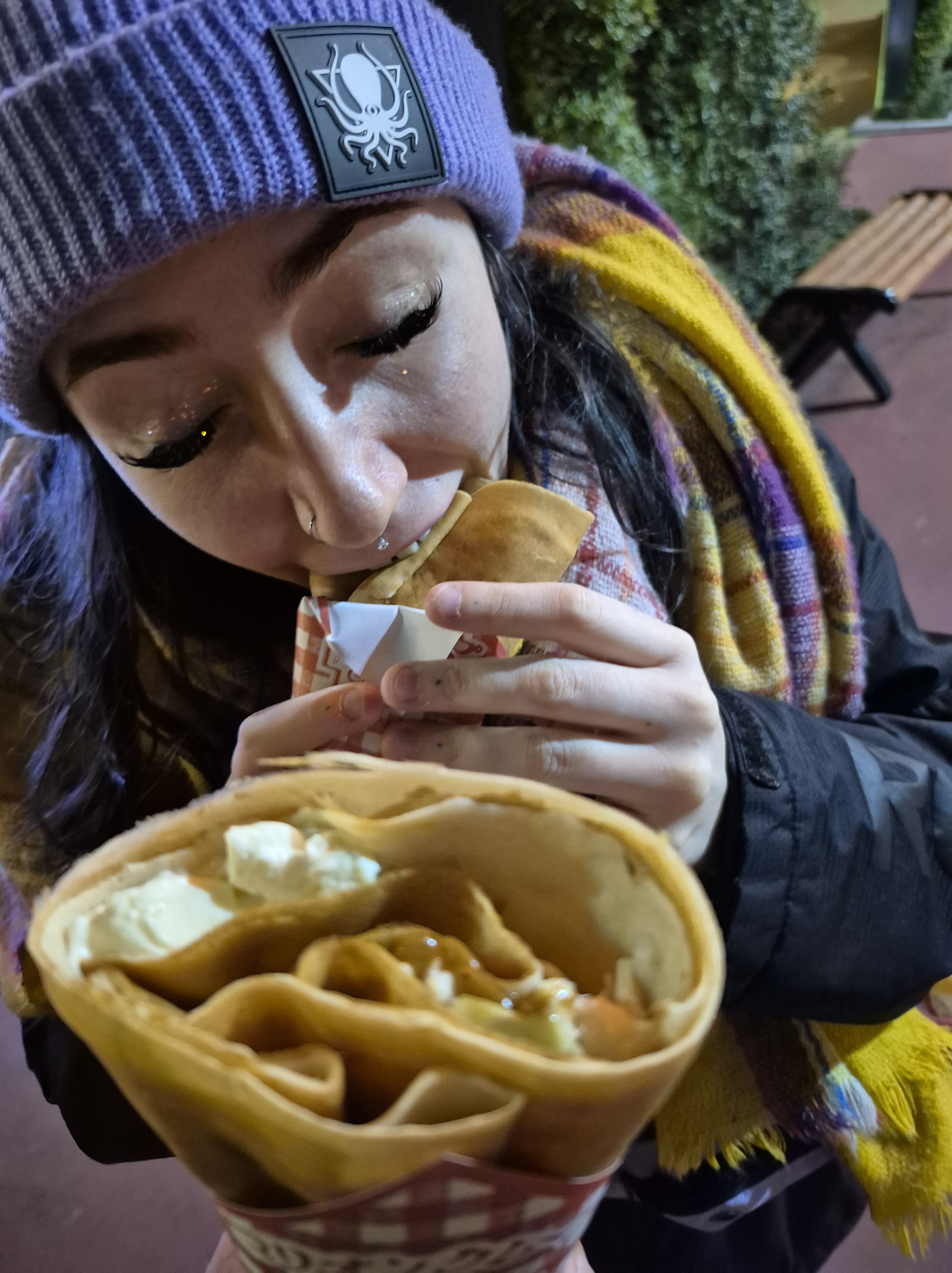A few hours later, fully rested we set off on a train ride across the city to go up the Tokyo Tower. Now me being the most thoughtful boyfriend in the world, completely blanked that Hannah is terrified of heights. The tower is a replica of the Eiffel tower or just very familiar. Its bloody tall. Well she did great and we went up the tower to gaze over Tokyo. It was not her favorite thing. On our way down to find a restaurant for dinner, our noses directed us to a crepe stand at the base of the tower. We had some delicious savory crepes for dinner, the Japanese have crepes dialed. I had a chicken, curry and cream cheese crepe. Hannah had a chicken teriyaki crepe with mayo. Both were stellar, its not were we intended to eat but it was delicious.